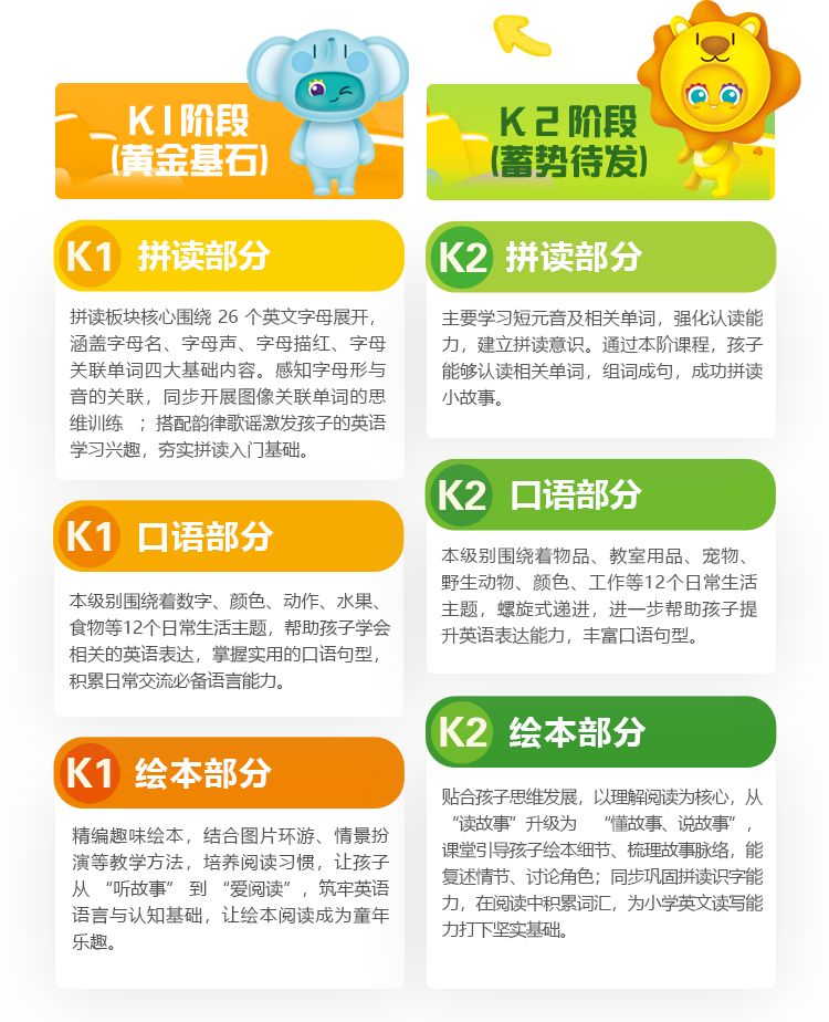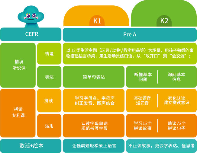 自研科学双语体系,绘本 + 歌谣 + 拼读 + 口语分级进阶